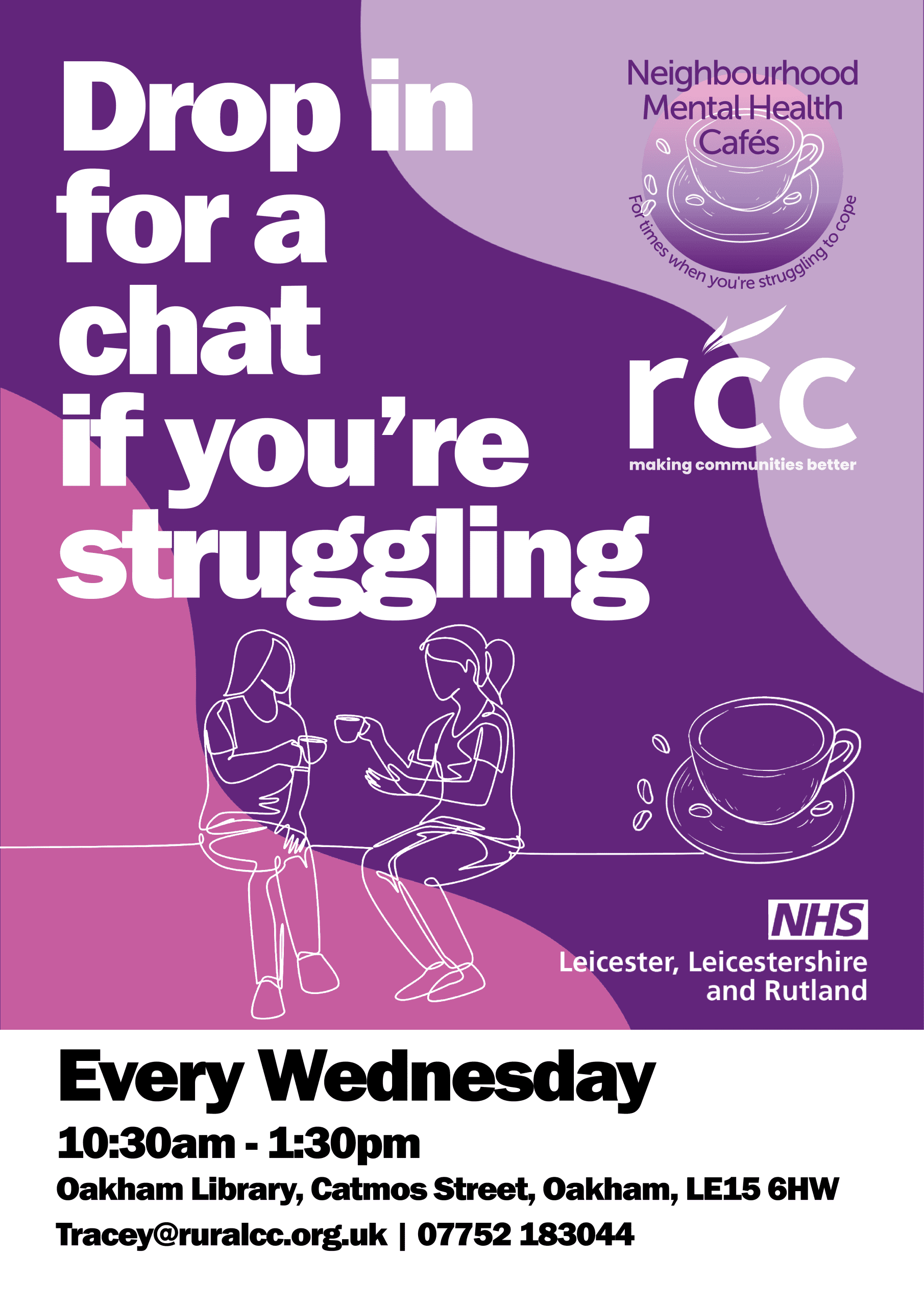 Our Oakham Mental Health Café runs every Wednesday as a drop in for anyone to come and talk to us about their mental health – no appointment needed. We have supportive, trained staff who will listen and provide the information and support you need in times of crisis.